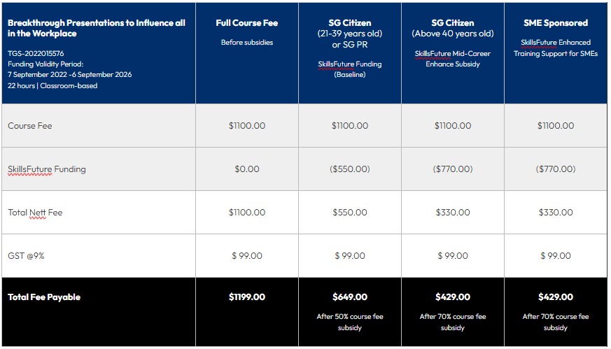 Through a wide range of group presentations, roleplay and feedback sessions, our expert trainers will be able to guide you find reliable solutions and overcome the challenges you face presenting in a business setting.The 3-day classroom-based course is eligible for SkillsFuture Credit.
